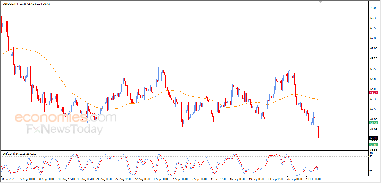 The (crude oil) slipped lower in its last intraday trading, to break the critical support at $61.50, amid the continuation of the negative pressure that comes from its trading below EMA50, with the emergence of the negative signals on the relative strength indicators, after offloading its oversold conditions, opening the way for recording more losses.