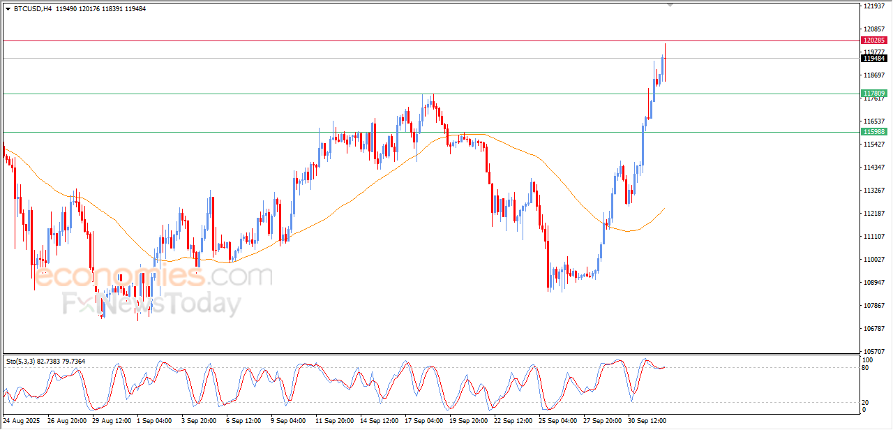 The (BTCUSD) price witnessed fluctuated trading on its last intraday levels, after approaching the resistance at $120,000, which represents our suggested target, to begin a profit-taking process for its previous rises, attempting to gain bullish momentum that might help it to resume the strong rise, besides the attempt of offloading its overbought conditions on the relative strength indicators, especially with the emergence of the negative signals from there.