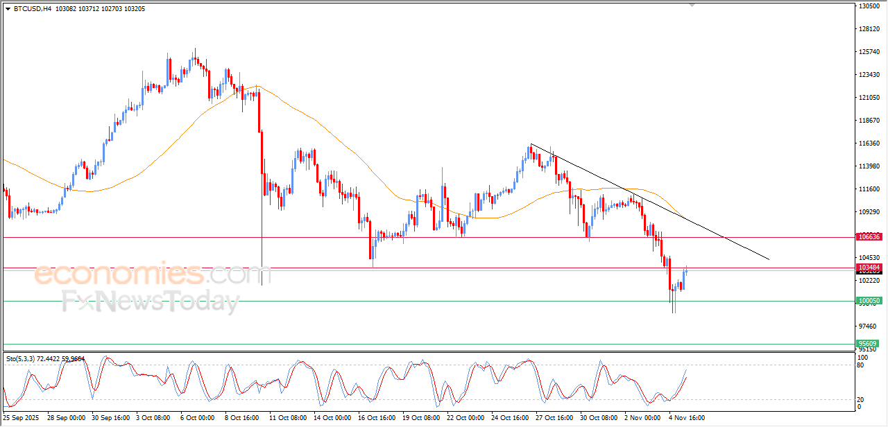 The (BTCUSD) price rose in its recent intraday trading, after its rise to attempt to recover some of its previous losses and succeeded in offloading its oversold conditions on the relative strength indicators, retesting the key resistance at $103,500, amid the dominance of the main bearish trend and its trading alongside minor trendline on the short-term basis.