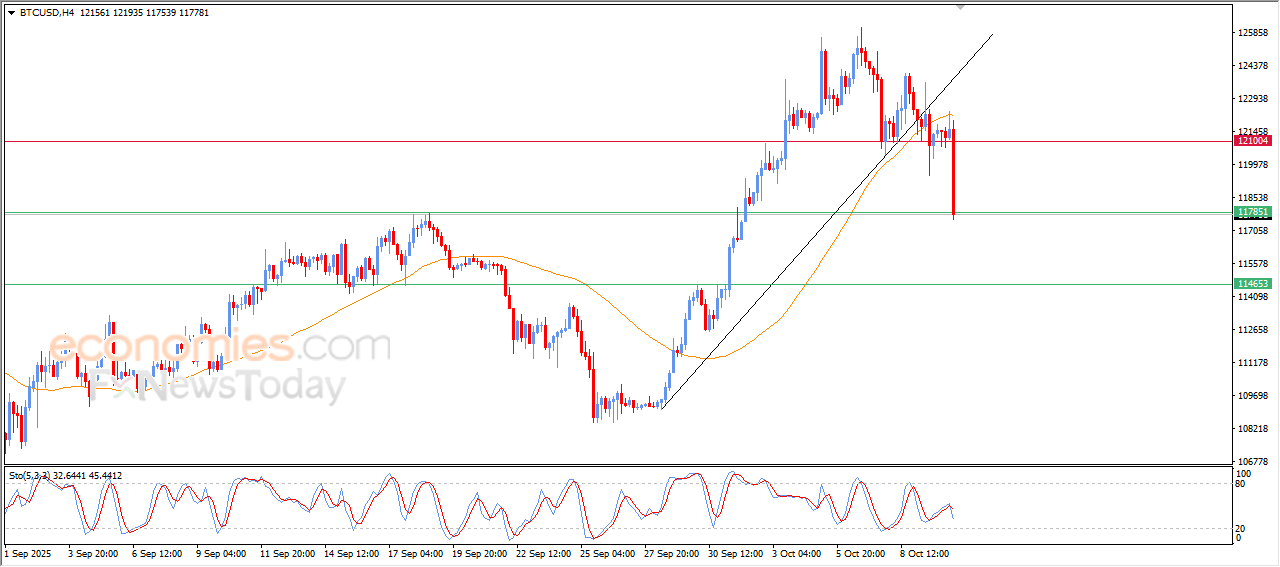 The (BTCUSD) price declined in its recent intraday levels, to break the support level at 121,000, to reach our expected target at $117,850 support, amid the continuation of the negative pressure due to its trading below EMA50, under the dominance of bearish corrective wave on the short-term basis, besides the emergence of the negative signals on the relative strength indicators, after offloading its oversold conditions, opening the way for recording more losses.