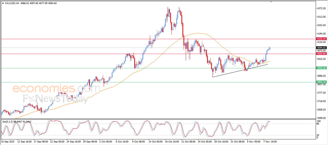 The (Gold) price kept rising in its last intraday trading, taking advantage of its stability above $4,050 support, by continuous positive pressure due to its trading above EMA50, on the other hand, we notice the emergence of negative crossovers on the relative strength indicators, after reaching overbought levels, which reduced the last gains of the price.