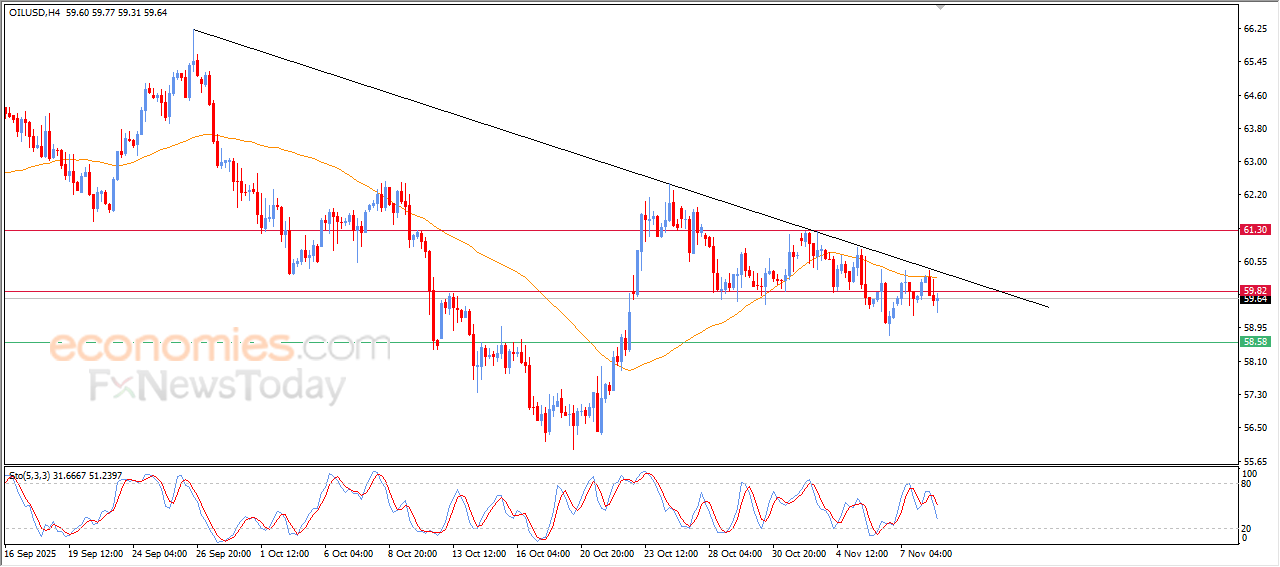 The (crude oil) witnessed fluctuated trading on its last intraday levels, with the continuation of the negative pressure that comes from its trading below EMA50, and under the dominance of the main bearish trend on the short-term basis and its trading alongside trend line, besides the emergence of the negative signals on the relative strength indicators.