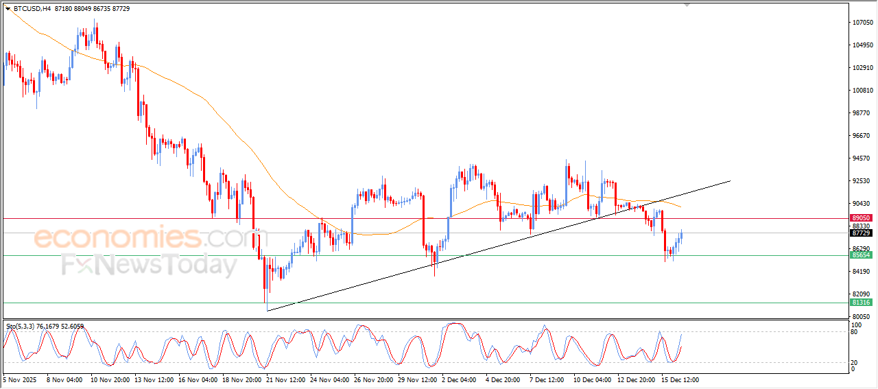 The (BTCUSD) price continued the cautious rise in its last intraday trading, supported by the emergence of the positive signals on the relative strength indicators, after reaching oversold levels, affected by breaking bullish corrective trend line on the short-term basis, with the continuation of the dynamic negative pressure that is represented by its trading below EMA50, reducing the chances of the price recovery on the near-term basis.