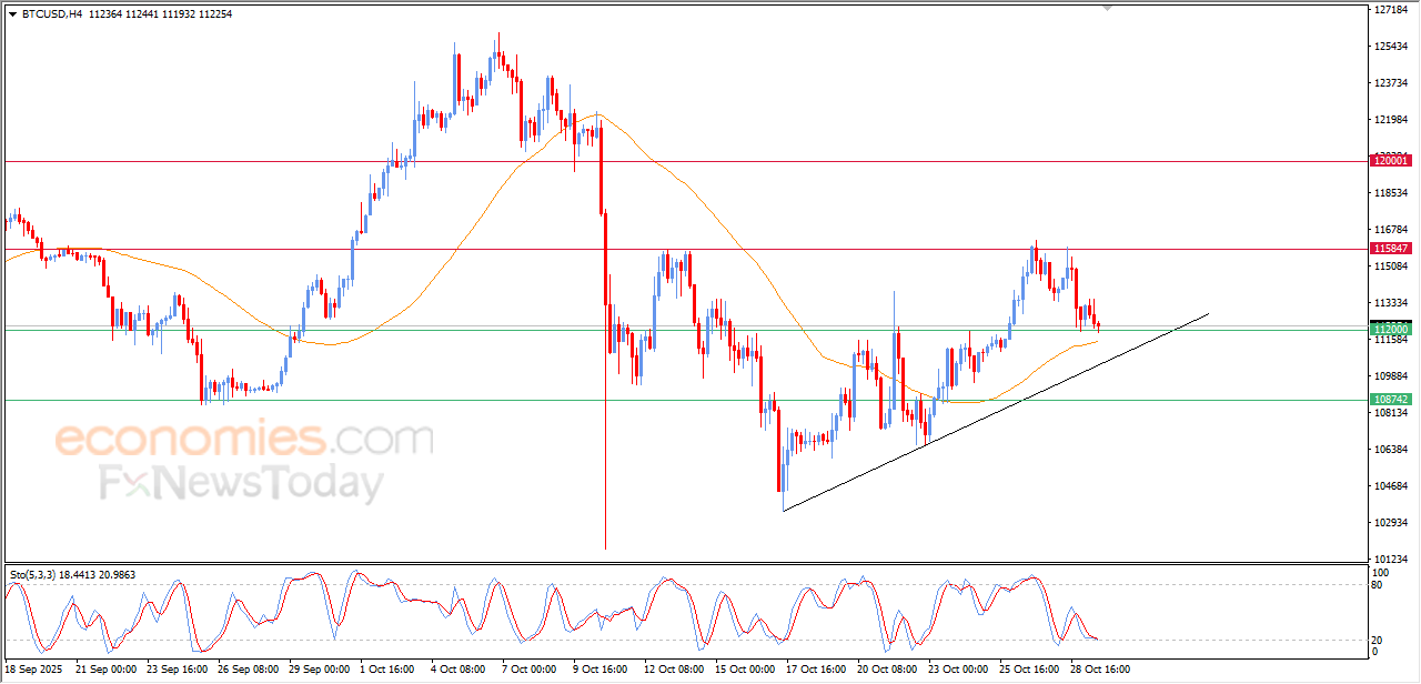 The (BTCUSD) price settled low in its recent intraday trading, to lean on the key support of $112,000, in a last attempt to gain the required positive momentum, which might help it to recover and rise again, amid the continuation of the dynamic support that is represented by its trading above EMA50, and under the dominance of the bullish corrective trend on the short-term basis and its trading alongside trendline.