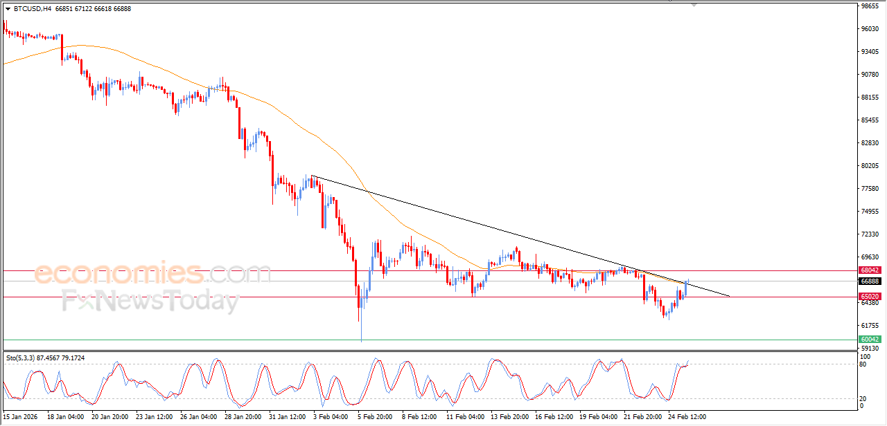 The (BTCUSD) price extended its gains to its last intraday levels, supported by the emergence of positive signals from relative strength indicators, despite reaching overbought levels, exaggeratedly compared to the price move, reaching EMA50’s resistance, intensifying the negative pressure on the price.