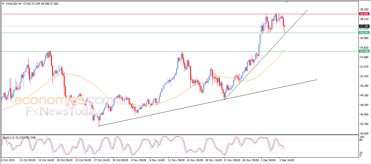 The price of (silver) declined in its last intraday trading, due to the stability of the solid resistance at $58.80, with the emergence of the negative signals on the relative strength indicators, after reaching overbought levels, attempting to gain bullish momentum that might help it to recover and rise again, especially with its trading alongside main and minor trend line on the short-term basis.