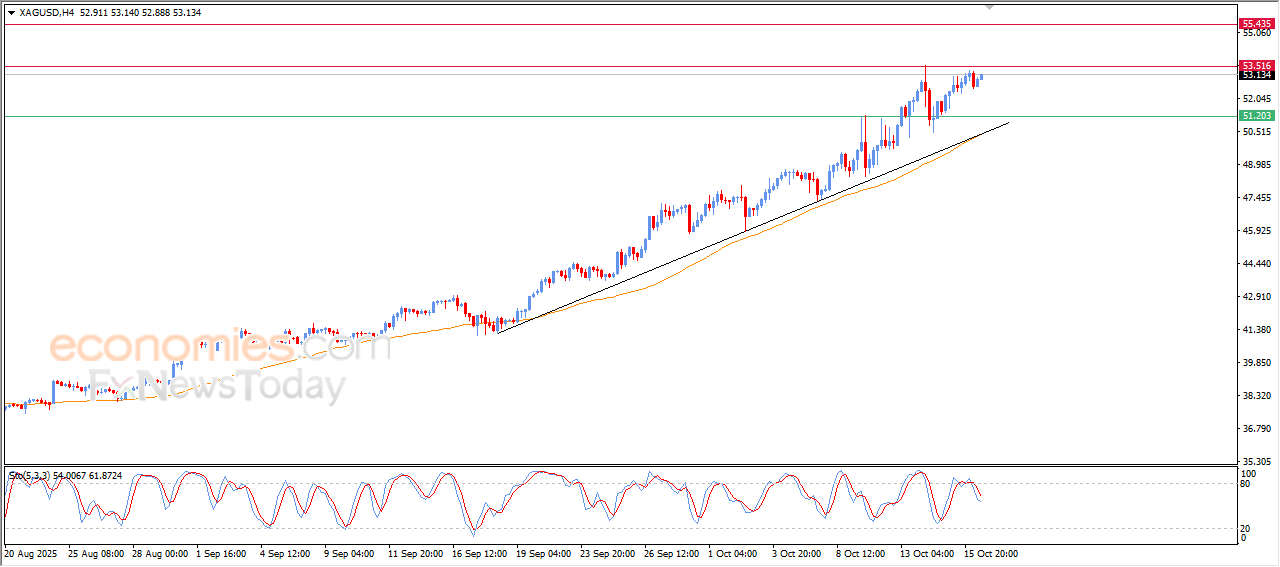 The price of (silver) rose in its last intraday trading, after offloading its overbought conditions on the relative strength indicators, opening the way for achieving more gains on near-term basis, preparing to attack the key resistance at $53.50, supported by its continuous trading above EMA50 and its trading alongside minor trendline.
