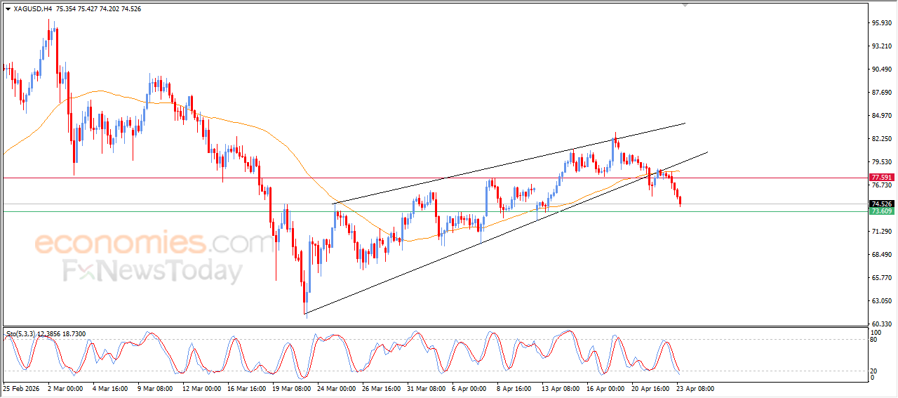Silver continued its decline in recent intraday trading, influenced by a negative technical formation on the short-term chart, specifically a rising wedge pattern. The downside pressure persists as the price remains below EMA50 increases the bearish momentum, especially with ongoing negative signals from the relative strength indicators, despite reaching heavily oversold levels.