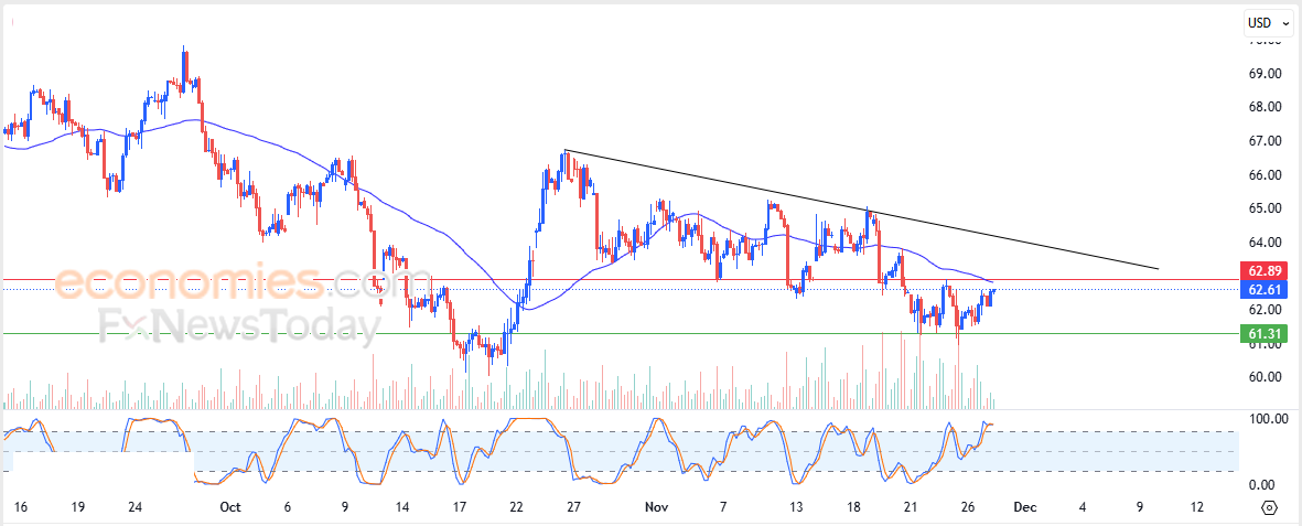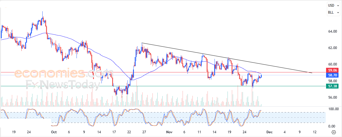 Brent crude oil price rose in its last intraday trading, attempting to correct the main bearish trend, amid its trading alongside supportive trend line for this track on the short-term basis, putting it under negative pressure due to its trading below EMA50, reducing the chances of its recovery in the upcoming period, especially with the emergence of the negative overlapping signals on the relative strength indicators, after reaching overbought levels, intensifying the negative pressure on the price.