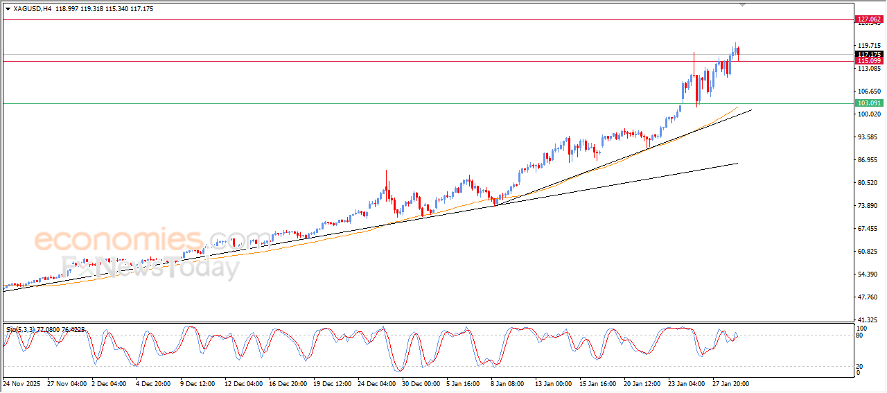 The price of (silver) declined in its last intraday trading, attempting to gain bullish momentum that may help it to recover and rise again and attempt to offload some of its overbought conditions on relative strength indicators, especially with the emergence of negative overlapping signals, amid the continuation of the dynamic support that is represented by its trading above EMA50, reinforcing the dominance and stability of the main bullish trend on short-term basis.