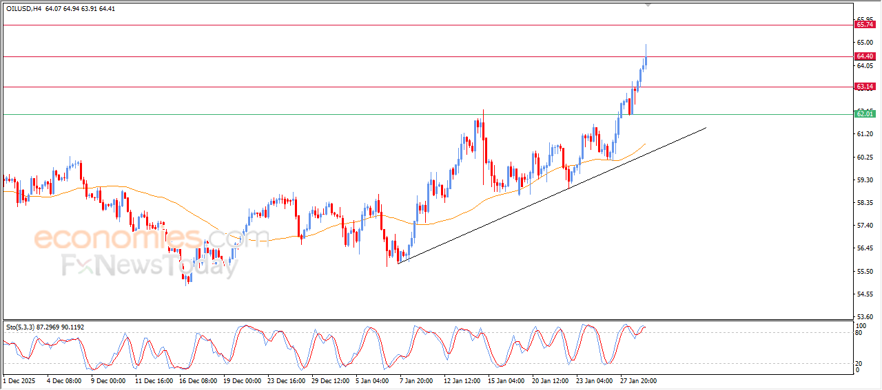 The price of (crude oil) extended its gains in its last intraday trading, reaching the expected target in our previous analysis at $64.40 resistance, amid the dominance of the main bullish trend on short-term basis, with the continuation of the positive pressure due to its trading above EMA50, besides the emergence of the positive signals from relative strength indicators, despite reaching overbought levels, which might reduce the upcoming gains.
