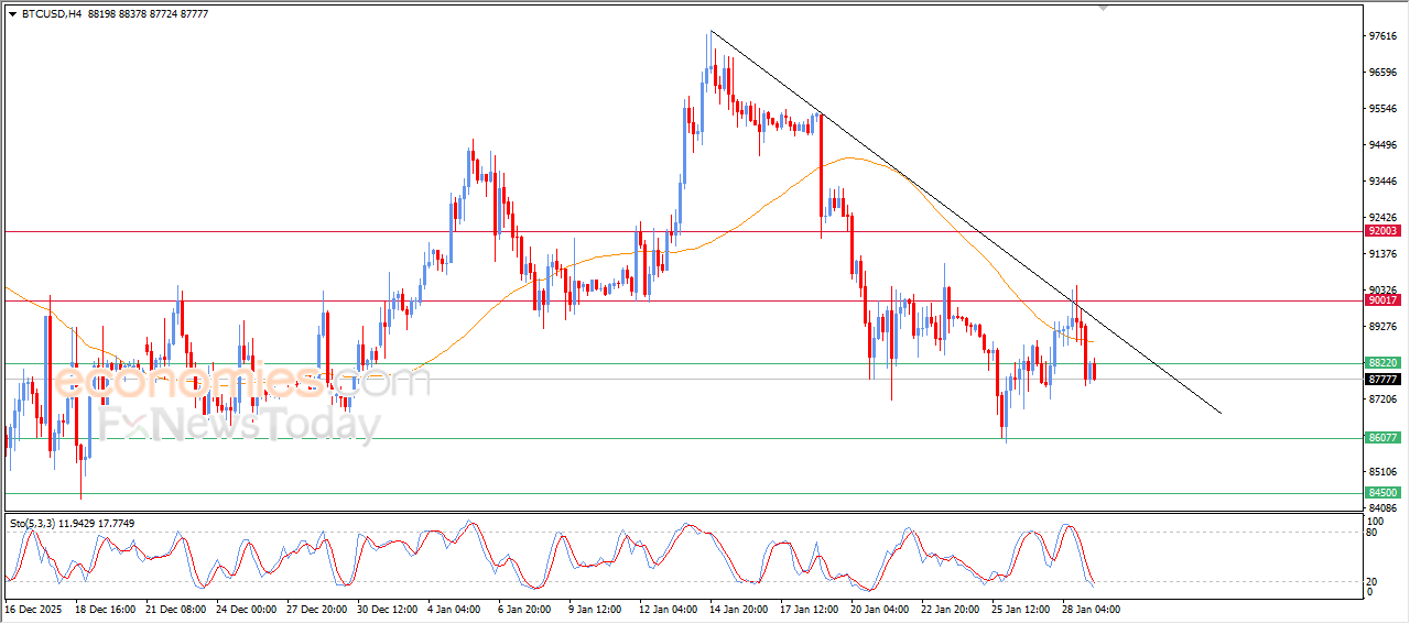 BTCUSD price declined in its last intraday trading, to remain stable below $88,000, amid its trading alongside bearish trend line on short-term basis, with the continuation of the dynamic negative pressure that is represented by its trading below EMA50, reducing the chances of the recovery on near-term basis, especially with the emergence of the negative signals from relative strength indicators, despite reaching oversold levels.