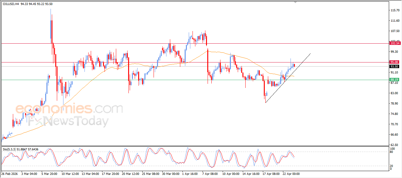 Crude Oil price declined in its latest intraday trading after holding below the $95.00 resistance level, to take profit from its previous gains and attempts to build positive momentum that could help it break above this resistance. Additionally, the price is offloading overbought conditions on the relative strength indicators, especially with emerging negative signals, while still benefiting from dynamic support as it trades above EMA50, which enhances the chances of resuming gains in the near term.