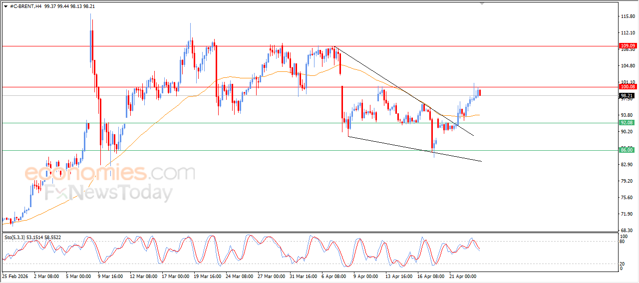 Brent crude oil declined in its recent intraday trading after holding below the key resistance level of $100.00, which was a target in our previous analysis. The price is taking profit from earlier gains and attempting to relieve overbought conditions on the relative strength indicators, especially with emerging negative signals. At the same time, it is gathering positive momentum that may help it break above this resistance, supported by continued dynamic strength as it trades above its EMA50, and influenced by a previously formed bullish technical pattern on the short term (falling wedge).