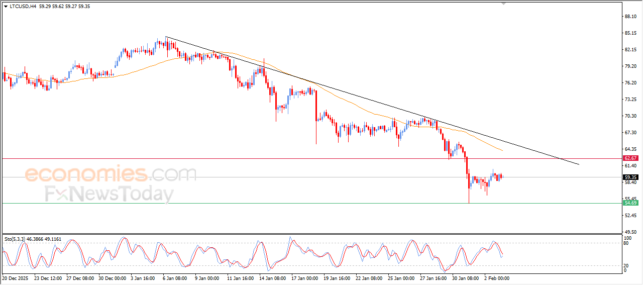 LTCUSD price recorded sideways trading with a cautious upward bias in its latest intraday moves, as it attempts to correct the main short-term downtrend while moving along a minor trend line supporting this corrective path. However, the setup remains under pressure as price continues to trade below its SMA50, which acts as dynamic resistance and prevents a sustainable recovery in the near term, especially with negative signals coming from the RSI after reaching overbought territory.