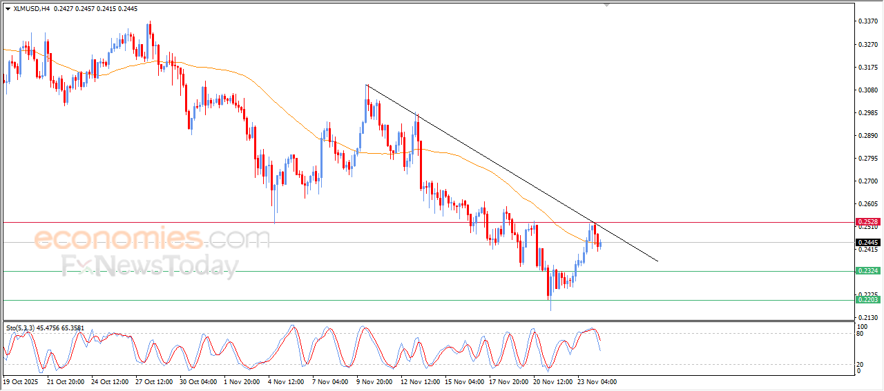 Stellar (XLMUSD) stabilized lower in its latest intraday trading, as the main downtrend continues to dominate its movement while trading along a short-term descending trendline supporting this bearish structure. The price has settled once again below the 50-period simple moving average, exposing it to further negative pressure in the coming period, especially with negative signals appearing on the Relative Strength Indicators after reaching extremely overbought levels. This reduces the chances of any meaningful recovery.