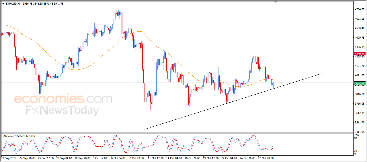 The (ETHUSD) price rose slightly in its last intraday trading, due to its leaning on the support of bullish corrective trendline on the short-term basis, gaining bullish momentum that intensified due to the emergence of the positive signals on the relative strength indicators, after reaching oversold levels, on the other hand, the price is under negative pressure due to its trading below EMA50, which weighs on the price recovery.