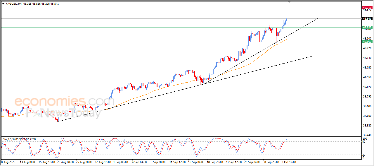 The (silver) price surged on its last intraday levels, to reach our last expected target at $47.50, supported by the emergence of the positive signals on the relative strength indicators, despite reaching overbought levels, amid the continuation of the positive pressure due to its trading above EMA50, and under the dominance of the main bullish trend and its trading alongside main and minor trendlines, reinforcing the stability of this trend.