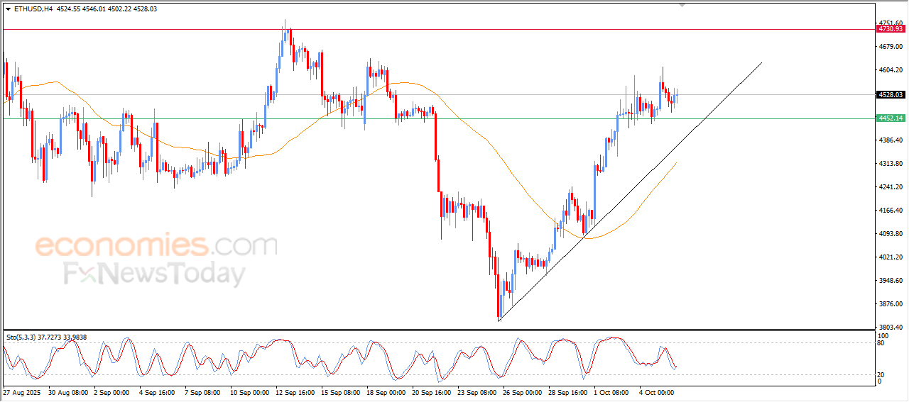 The (ETHUSD) price rose in its last intraday trading, amid the dominance of the bullish corrective trend on the short-term basis and its trading alongside steep trendline, indicating the strength and dominance of this trend, especially with the continuation of the positive pressure that comes from its trading above EMA50, besides the emergence of positive overlapping signals on the relative strength indicators, after reaching exaggerated oversold levels compared to the price movement, which suggest forming a positive divergence, adding more bullish momentum on its coming trading.
