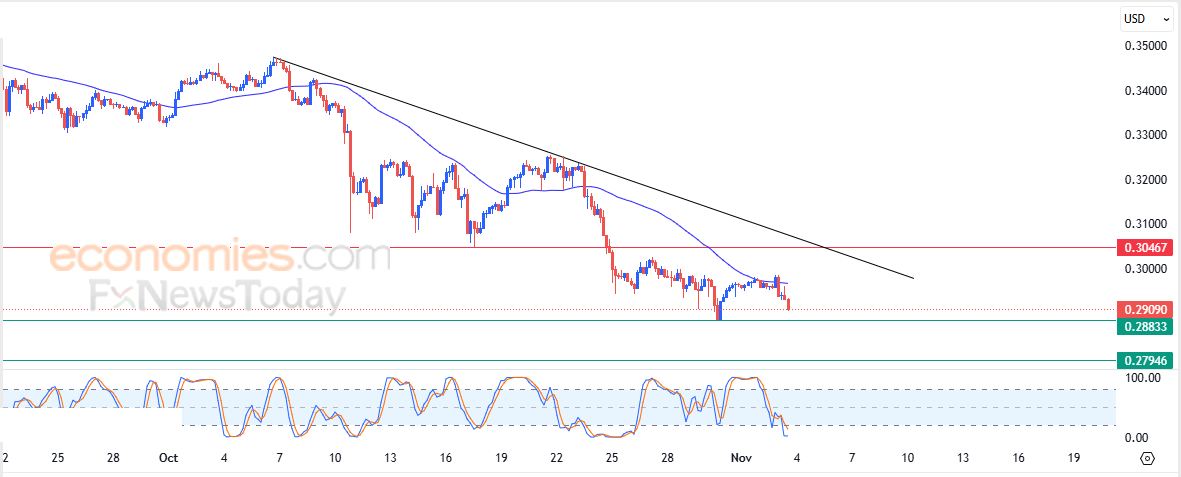 Therefore, we expect the cryptocurrency to decline in its upcoming intraday trading, targeting the key support level of $0.28833 in preparation to break below it.