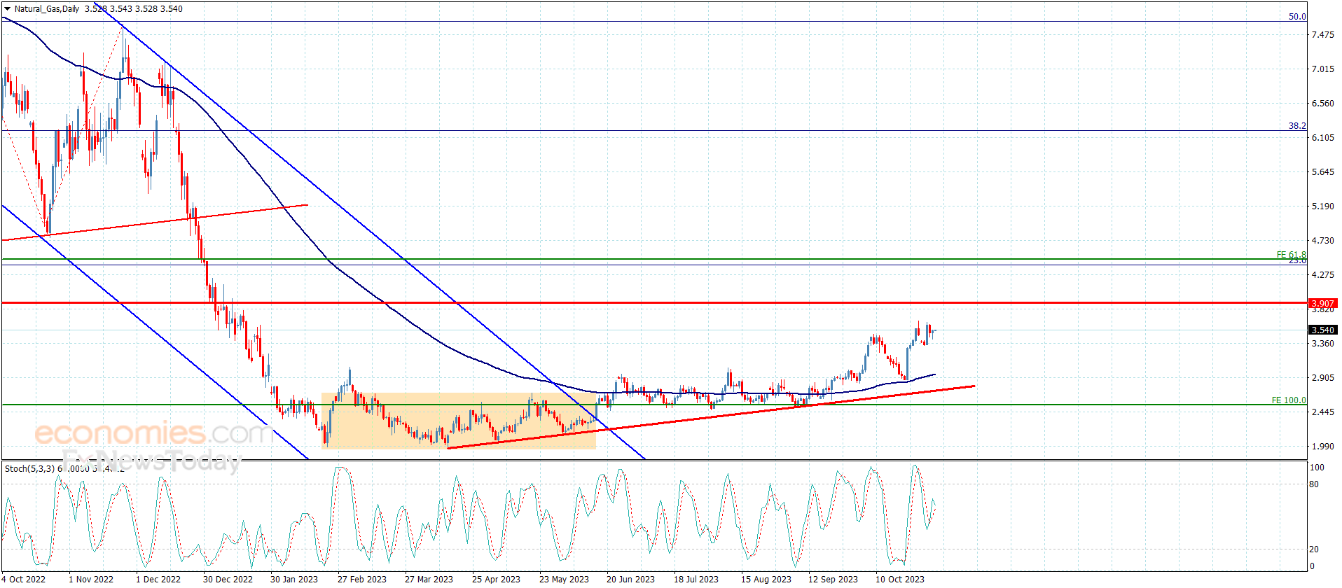 Natural gas price started to gather the positive momentum due to stochastic rally above 50 level, to notice forming some positive waves by settling near 3.550, also, 3.250 level forms additional support to increase the chances of activating the bullish attack, to expect rallying towards 3.750 level soon, followed by attempting to press on the additional barrier 3.950, which forms the first main target for the current trades.