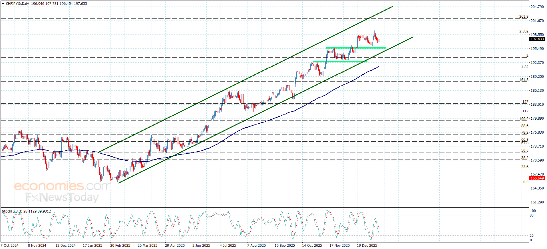 No change on CHFJPY price track until this moment, due to its stability within the bullish channel levels besides the continuation of forming extra support at 195.65 level, to reinforce the chances of facing stochastic and fluctuating near 197.55 level.