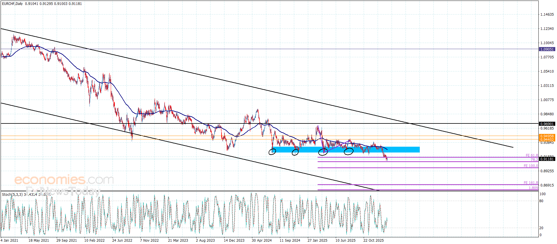 The EURCHF continued to form bearish waves in the last period, to reach the second target at 0.9075 which represents %78.2 Fibonacci extension level.