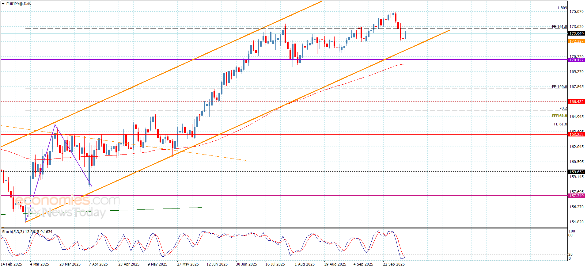 The EURJPY pair kept its positive stability above the extra support level at 172.20, which allowed it to achieve some gains, to notice its rally towards 173.20, approaching from the initial barrier at 173.40 level.
