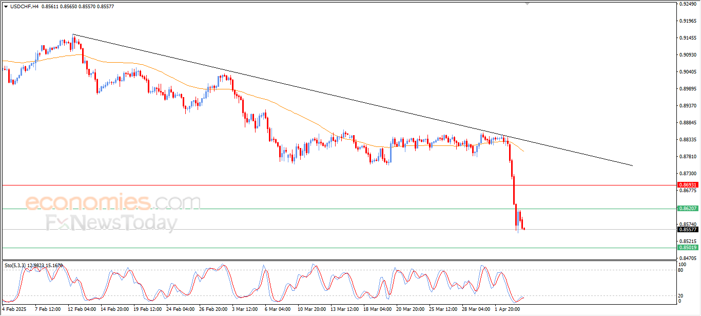 USD/CHF price sustained heavy losses in latest intraday trading, amid the total dominance of the main downward trend in the short term while trading alongside the trend line, with ongoing negative pressure due to trading below the 50-candle SMA, as the latest decline came after the price tried to vent off oversold saturation in the Stochastic, before resuming its fall quickly, reflecting the strength of this trend.
