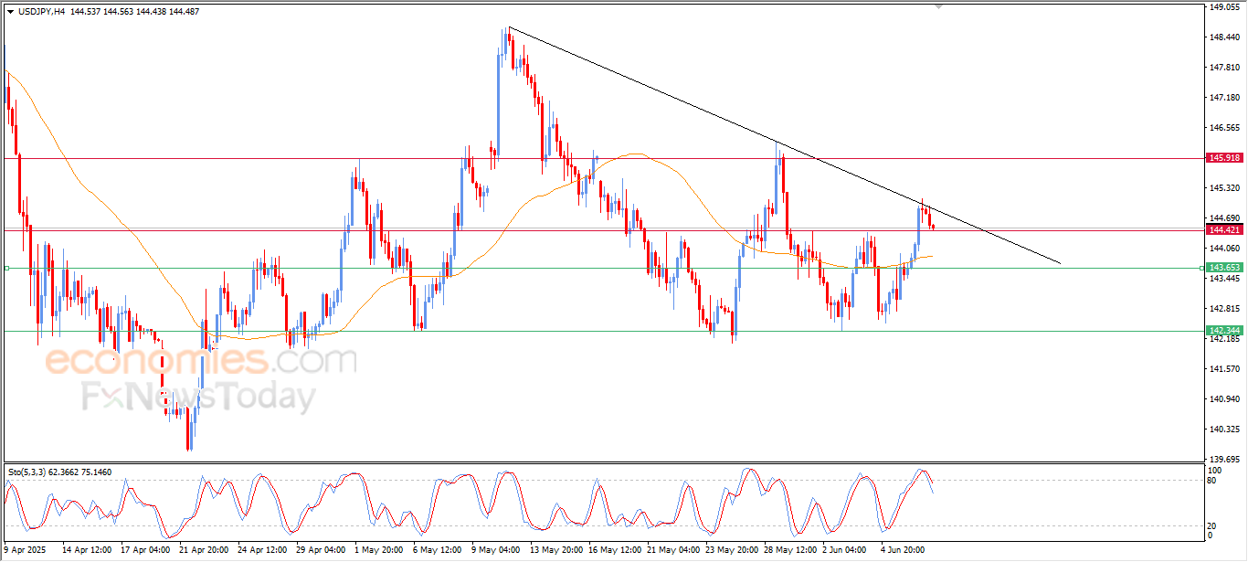 The (USDJPY) price declined in its last intraday trading, as it reached the resistance line of the bearish correctional trend on the short-term basis, with the emergence of the (RSI), after reaching overbought levels, surrendering to these negative pressures and losing the positive momentum, especially that there is a dynamic support represented by its trading above its EMA50.