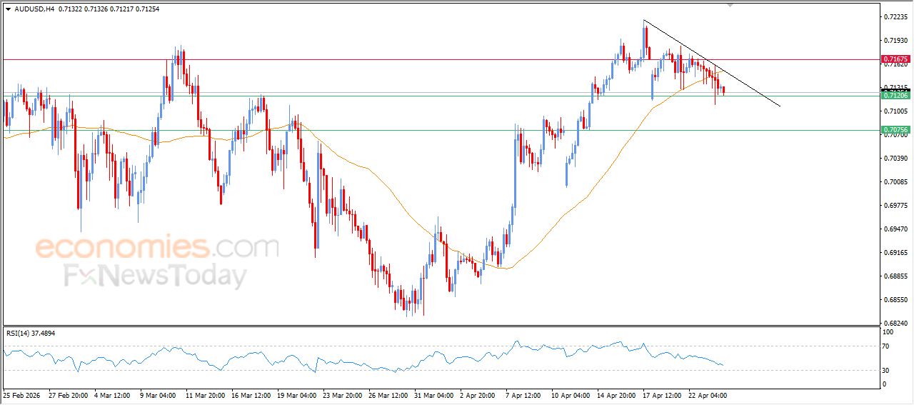 The AUDUSD pair declined during recent intraday trading and is now preparing to break the key support level at 0.7120. This comes amid a short-term bearish corrective wave, with the pair moving along a descending trendline that supports this downward path. Negative and dynamic pressure remains in place as the price continues to trade below EMA50, increasing the downside pressure on the pair, reinforced by negative signals from the relative strength indicators, despite reaching deeply oversold levels.