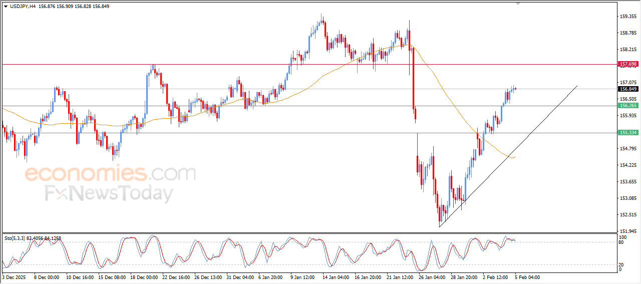The (USDJPY) settles on extended gains on its last intraday levels, amid the dominance of bullish corrective trend on short-term basis and its trading alongside supportive trend line for this path, with the continuation of the positive dynamic pressure due to its trading above EMA50, on the other hand, we notice the emergence of negative signals from relative strength indicators, after reaching overbought levels, which might obstructs the upside track in the upcoming period, so we might witness some fluctuations that target to offload some of these overbought conditions.