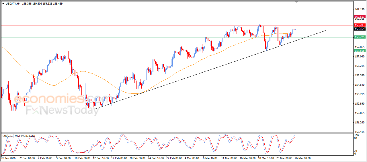 The USDJPY pair continues to stabilize within a series of gains in its recent intraday trading and is now preparing to challenge the key resistance level at 159.75. This bullish momentum is supported by dynamic support from trading above EMA50, reinforcing the stability and dominance of the short-term bullish trend, especially as price moves along an upward trendline.