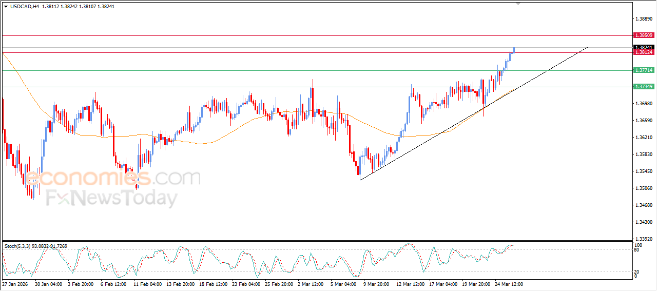 The USDCAD pair continued its upward movement in recent intraday trading, successfully breaking above the 1.3800 resistance level, which had been a target in our previous analysis. The pair remains under the control of a dominant bullish trend, trading along a supportive minor trendline, in addition to ongoing positive pressure as it trades above EMA50.