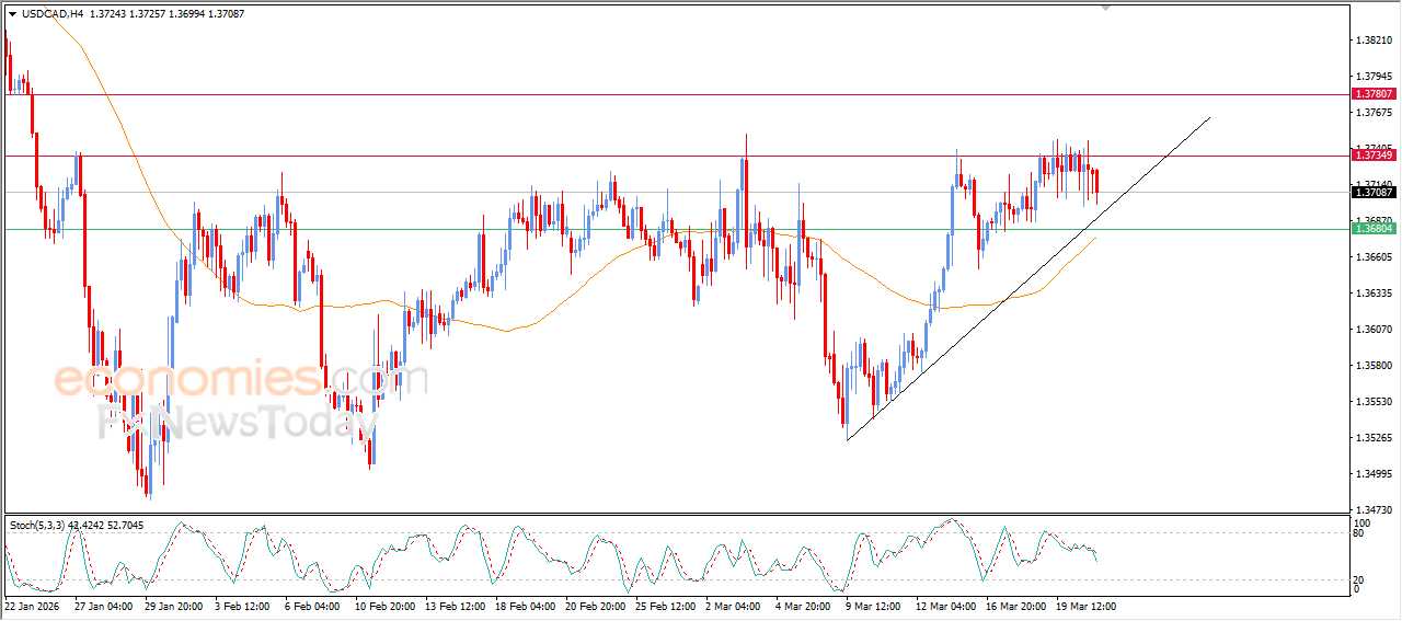 The USDCAD pair declined during its latest intraday trading due to the firmness of the key and strong resistance level at 1.3735, alongside emerging negative signals from the relative strength indicators. The pair is now attempting to gain positive momentum that may help it break above this resistance.