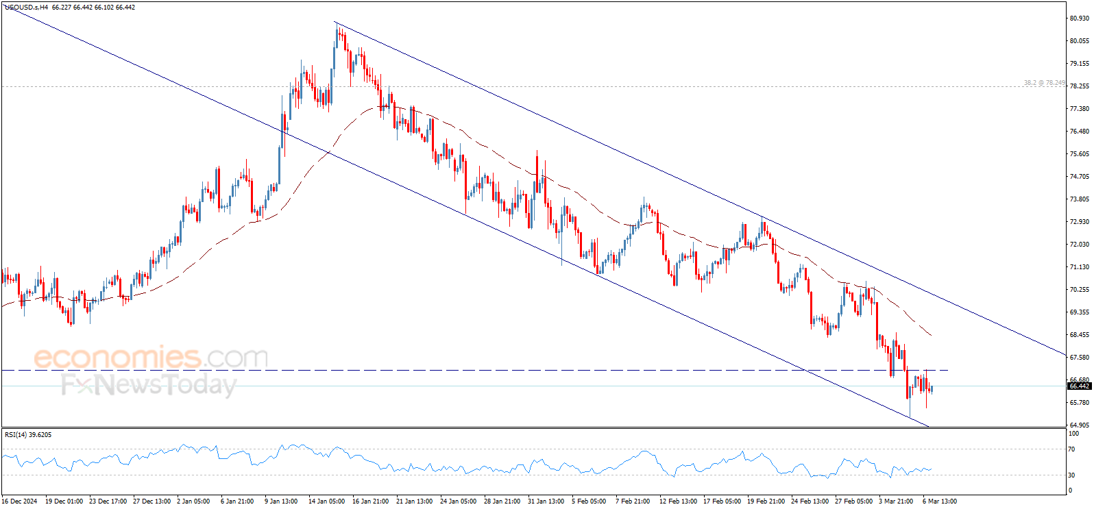Crude oil price tested the resistance line formed at 67.05$ and kept its stability below it, to keep the negative scenario active, waiting to get negative motive that push the price to resume the bearish wave within the bearish channel that appears on the chart.