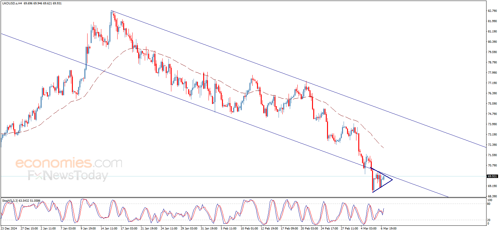 Brent oil price trades are confined within bearish pennant pattern that appears on the chart, thus, the price needs to break this pattern’s support line at 69.30$ to activate the negative effect of the mentioned pattern followed by rallying to resume the expected main bearish trend on the intraday and short-term basis.