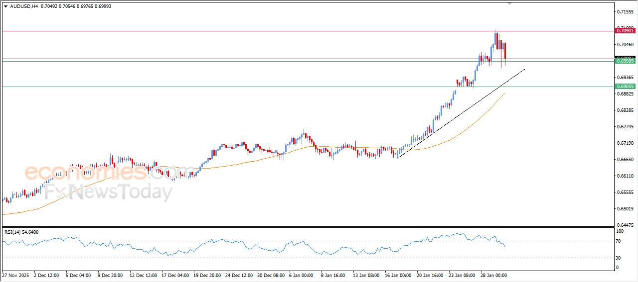 The (AUDUSD) price declined in its last intraday trading, amid the emergence of negative signals from relative strength indicators, after reaching overbought levels, gathering the gains of its previous rises, attempting to gain bullish momentum that might help it to recover and rise again, amid the continuation of the dynamic support that is represented by its trading above EMA50, reinforcing the stability and dominance of the main bullish trend on short-term basis, especially with its trading alongside minor trend line.
