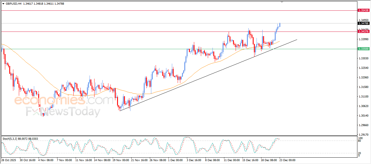 GBPUSD kept rising in its last intraday trading, breaching the key resistance at 1.3435, this resistance represents a target in our previous analysis, amid the continuation of the dynamic support that is represented by its trading above EMA50, and under the dominance of the main bullish trend on the short-term basis and its trading alongside supportive trend line for this trend, besides the emergence of positive signals on relative strength indicators, despite its stability in overbought levels.