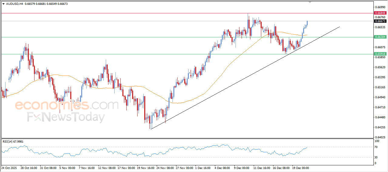 The (AUDUSD) price kept rising in its last intraday trading, after surpassing the negative pressure of EMA50 and taking advantage of its dynamic support, amid the dominance of the main bullish trend on the short-term basis and its trading alongside supportive trend lien, besides the emergence of positive signals on the relative strength indicators, despite reaching overbought levels.