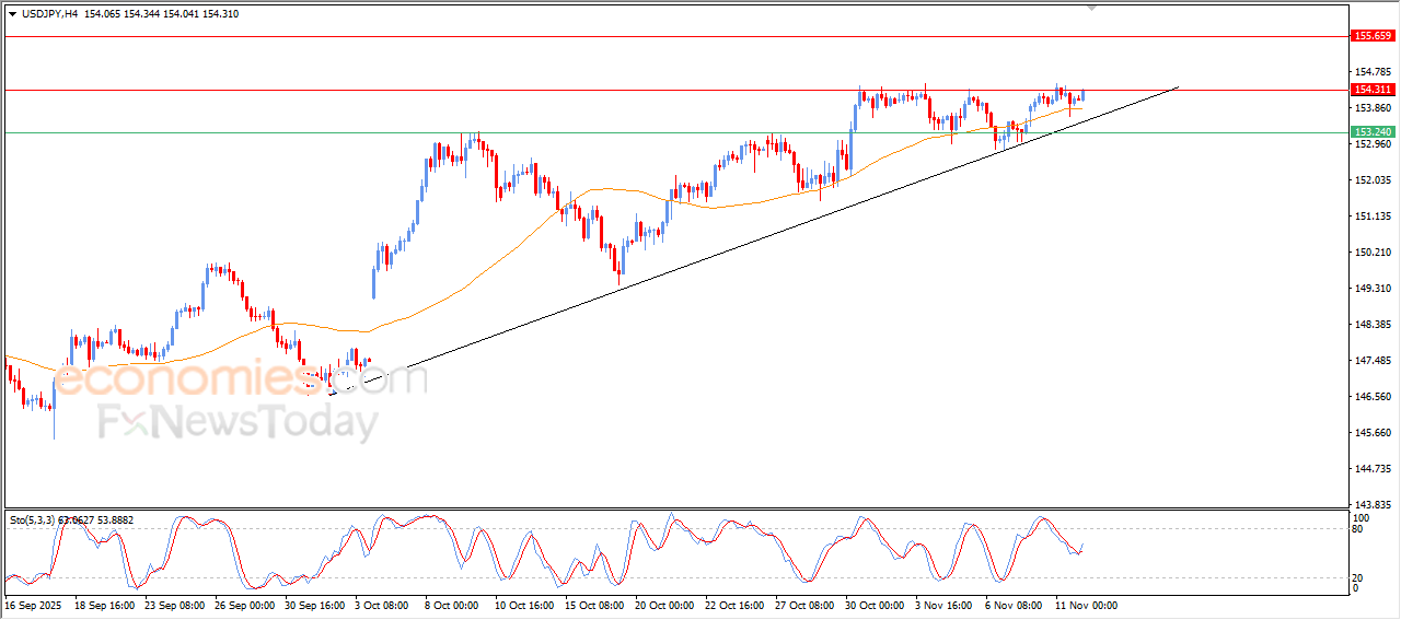 The (USDJPY) rose in its last intraday trading, attacking the stubborn and key resistance at 154.30, supported by its continuous trading above EMA50, which reinforces the stability of the dominant bullish trend on the short-term basis, especially with its move alongside trend line, and the emergence of positive signals on the relative strength indicators, after offloading its overbought conditions, opening the way for achieving more of the gains on the near-term basis.
