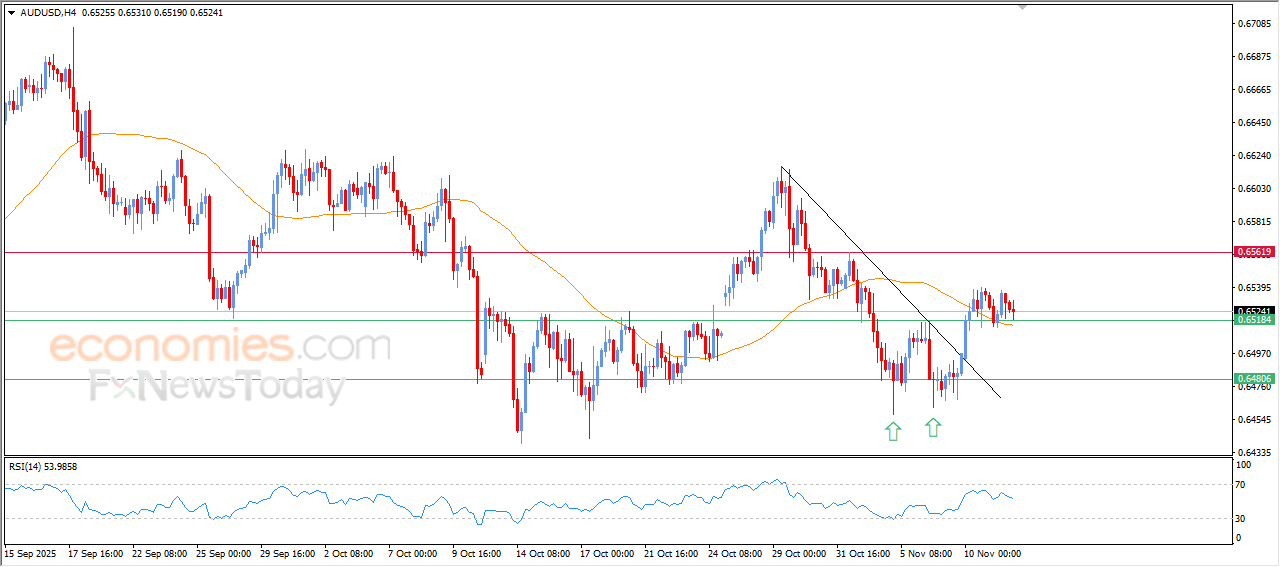 The (AUDUSD) price declined in its last intraday trading, amid the emergence of the negative signals on the relative strength indicators, after reaching overbought levels, to attept to gain bullish momentum that might help it recover and rise again, and it is attempting to offload this overbought condition, leaning on the support of its EMA50, affected by positive technical formation on the short-term basis that is represented by the double bottom pattern.