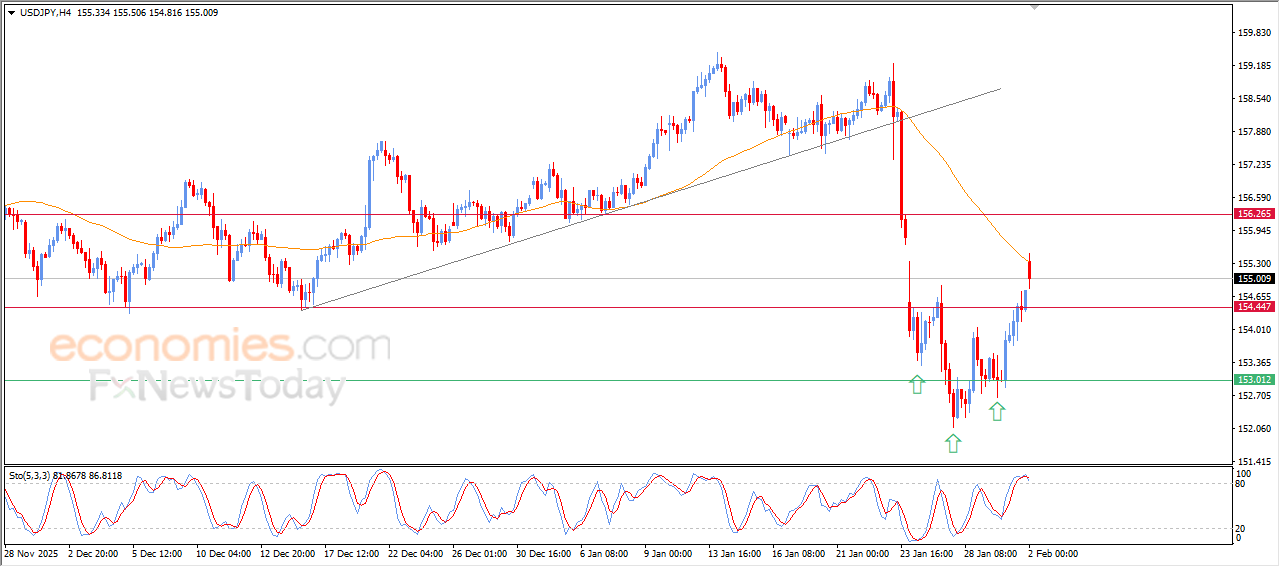 The (USDJPY) surged high in its last intraday trading, breaching 154.45 key resistance, amid the dominance of strong bullish corrective wave on intraday basis, due to the effect of positive technical pattern that formed on short-term basis (inverted head and shoulders pattern), to attempt to surpass the negative pressure of EMA50, announcing its momentum to extend its corrective gains, on the other hand, we notice the emergence of negative signals from relative strength indicators, after reaching overbought levels, which might decelerate the price rise temporarily.
