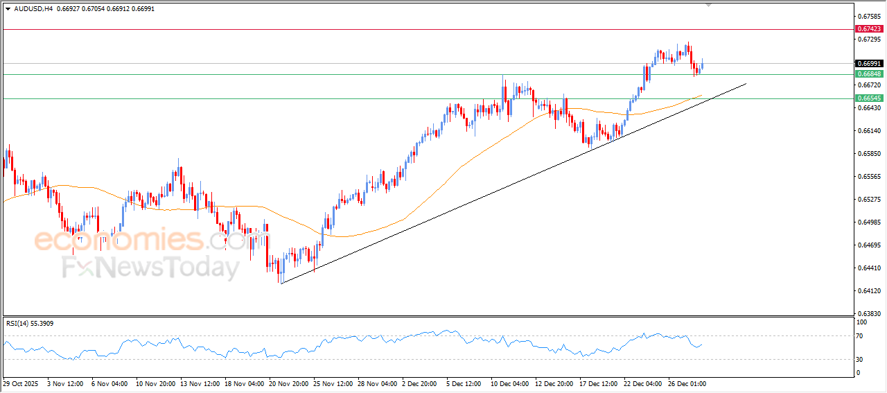 The (AUDUSD) price rose on its last intraday levels, due to the stability of the support level at 0.6685, gaining some bullish momentum that helped it to achieve these gains, amid the continuation of the dynamic support that is represented by its trading above EMA50, reinforcing the strength and dominance of the main bullish trend on the short-term basis, especially with its trading alongside trend line, besides the emergence of the positive signals from the relative strength indicators, after reaching oversold levels.