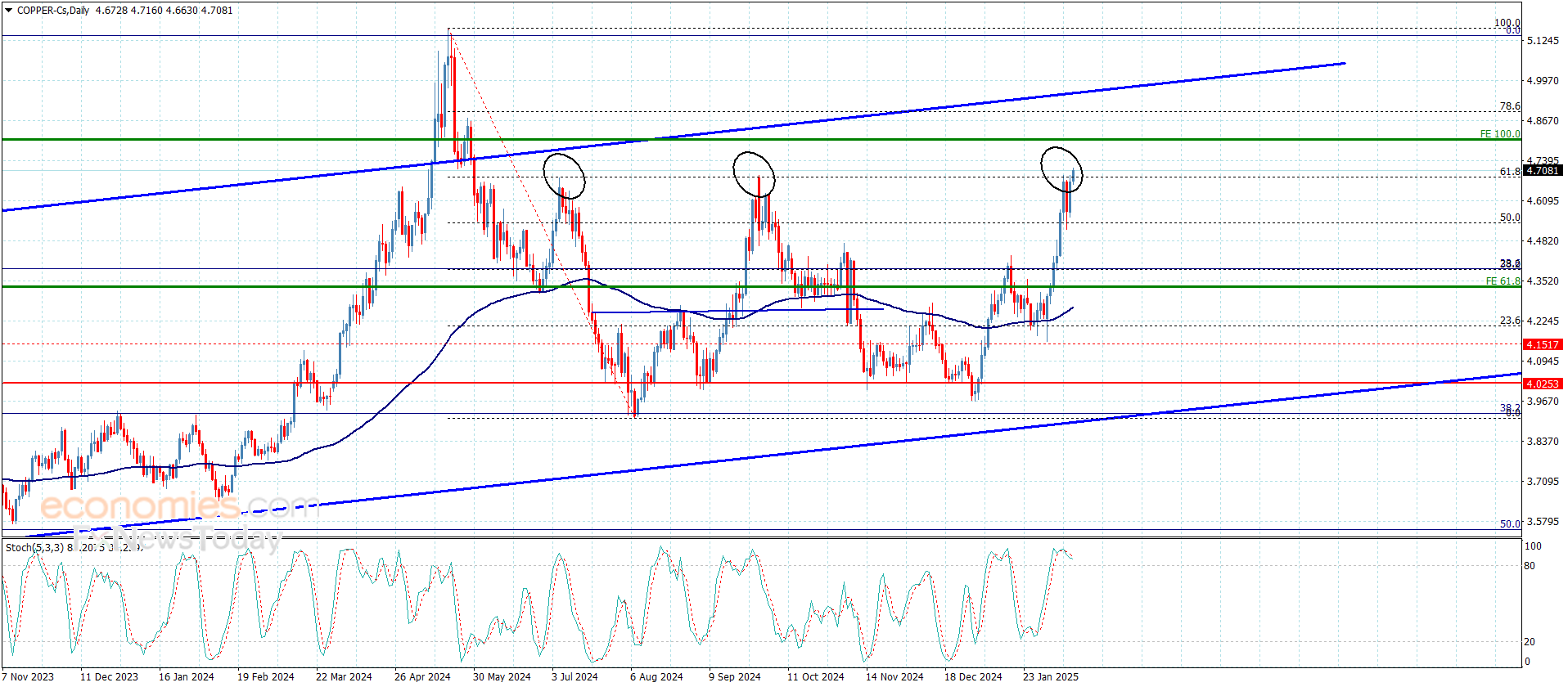 Copper price returned to renew the bullish attempts after holding above 50% Fibonacci correction level at 4.5400$, to surpass 4.6900$ resistance line this morning and hint its preparation to resume the bullish attack by settling near 4.7100$.
