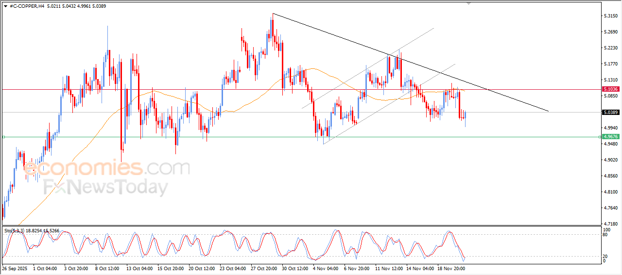 Copper price rose in attempt to recover its previous losses, and it attempts to recover some of its losses, attempting to offload some of its clear overbought conditions, especially with the emergence of positive overlapping signals, amid the continuation of the negative pressure due to its trading below EMA50, reinforcing the dominance and stability of the bearish corrective trend on the short-term basis with its trading alongside supportive trend line.