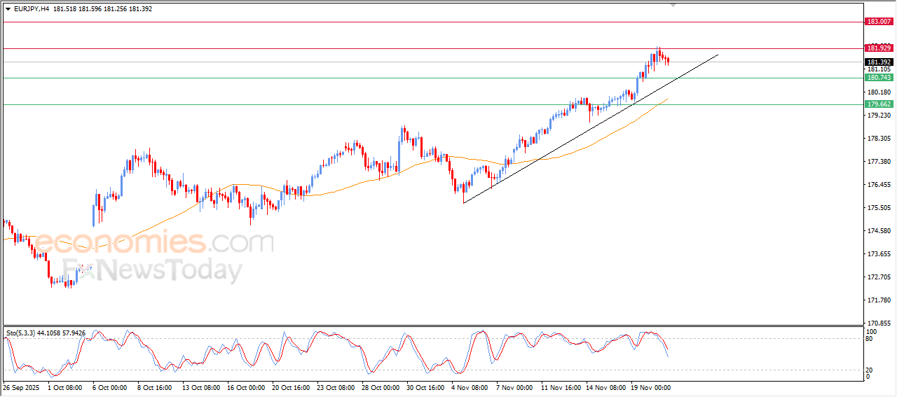 The EURJPY pair declined slightly in the last intraday levels, amid the emergence of the negative signals on the relative strength indicators, after reaching overbought levels, to gain bullish momentum that might help it to recover and rise again, amid the dominance of the main bullish trend and its trading alongside supportive trend line, and there is continued dynamic support due to its trading above EMA50, reinforcing the chances of its recovery in the upcoming perio.