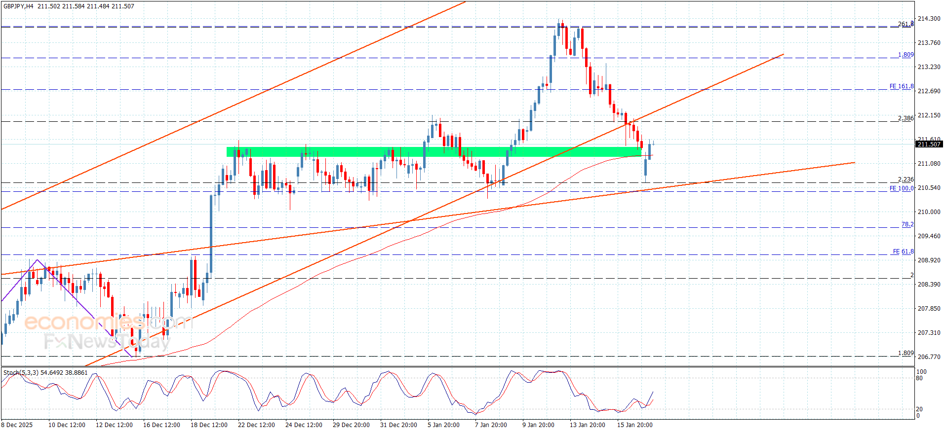 The GBPJPY pair opened today’s trading with bearish price gap, to suffer some losses by reaching 210.65 and facing strong support base that represents support line that confirms the bullish scenario in the upcoming trading, to notice its rally towards 211.55 again.