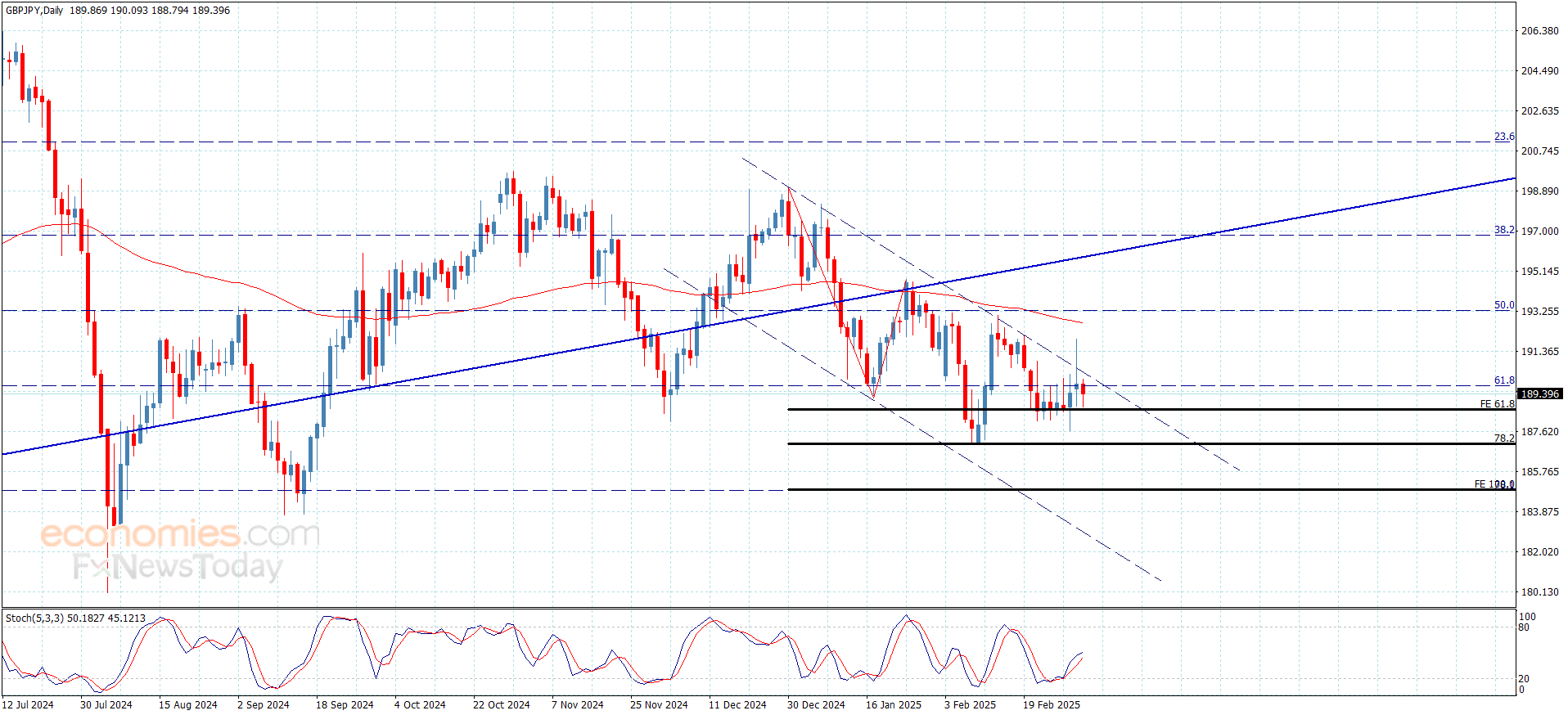 The GBPJPY pair attempted to exit the negative track yesterday by surpassing 190.60 resistance line, achieving temporary gains by touching 191.95 followed by turning back to settle within the bearish channel by fluctuating near 189.60 now.
