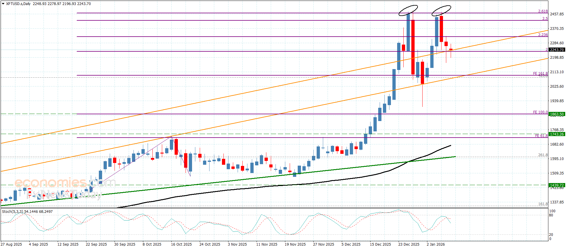 Note that the continuation of providing negative momentum by stochastic will push the price to renew the corrective attempts, to expect reaching $2180.00. breaking this barrier will extend the trading towards $2130.00, representing the next target of the current trading, while breaching $2320.00 level will cancel the negative scenario, which allows it to form new bullish waves to press again on the historical high at $2460.00 level.